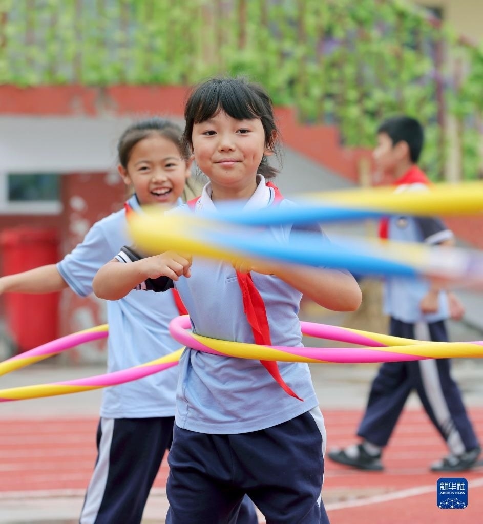 5月30日,河北省邢臺(tái)市廣宗縣第六小學(xué)學(xué)生在參加呼啦圈游戲。 新華社發(fā)(王壘攝)