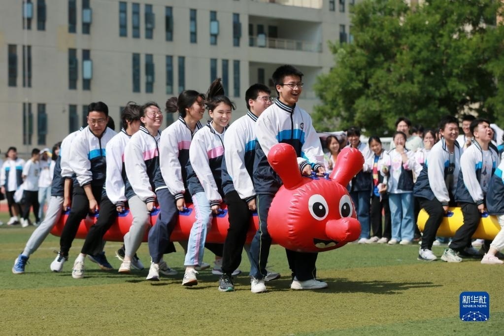高考臨近,安徽省淮北市第十二中學(xué)組織高三年級(jí)學(xué)生開(kāi)展豐富多彩的集體減壓活動(dòng),讓學(xué)生們?cè)谌の队螒蛑嗅尫艍毫Γ暂p松、樂(lè)觀(guān)、自信的心態(tài)迎接高考。新華社發(fā)(萬(wàn)善朝 攝)