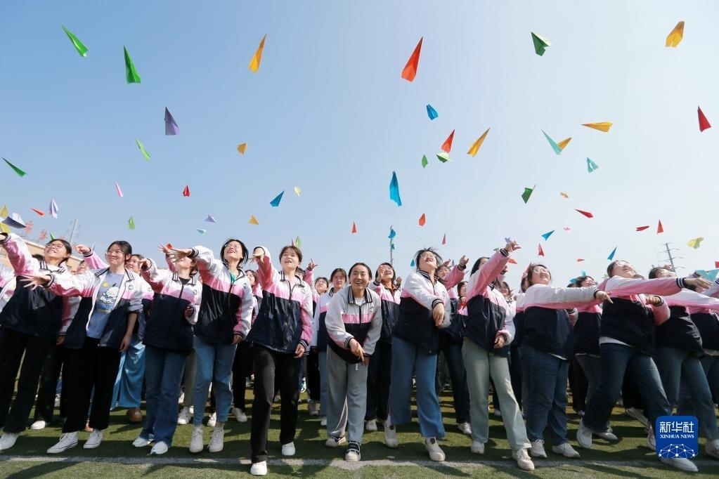 5月31日,在淮北市第十二中學(xué),高三學(xué)生在操場(chǎng)上扔紙飛機(jī)。