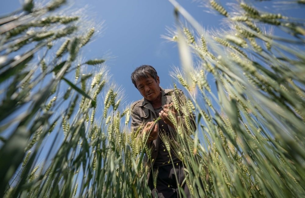 5月23日,農(nóng)民在河北滄州渤海新區(qū)黃驊市福源種植合作社的麥田里查看鹽堿地小麥長(zhǎng)勢(shì)。新華社記者 駱學(xué)峰 攝