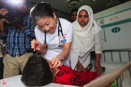 2013年,“和平方舟”號醫(yī)院船再次來到孟加拉國。上萬民眾自發(fā)涌向中國醫(yī)院船,最高單日門診1700余人次。3歲的阿里法·沁健康么?中國軍醫(yī)牽掛著她。她家住在偏僻農(nóng)村,中國軍醫(yī)設法找到了她,邀請她登上“和平方舟”號醫(yī)院船體檢。