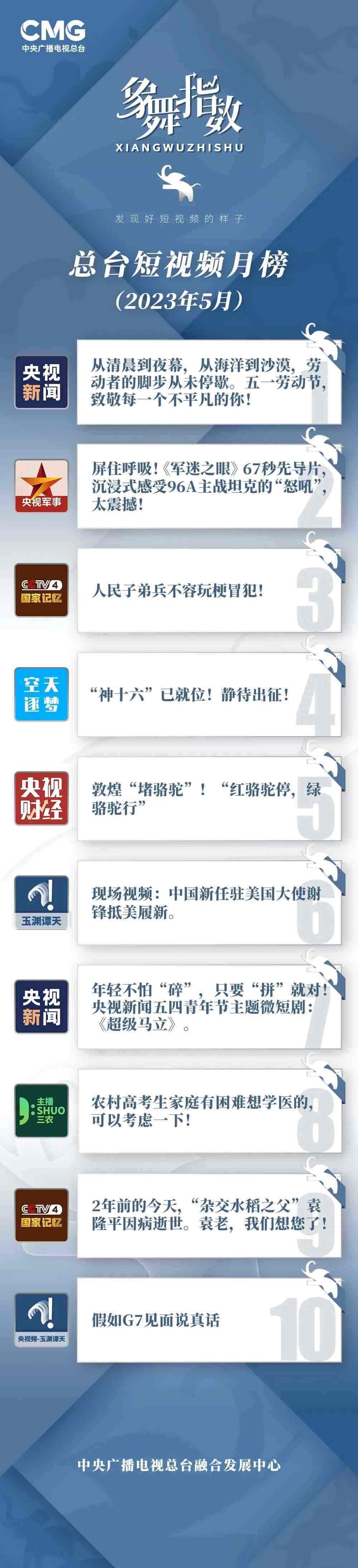 中央廣播電視總臺“象舞指數(shù)”評議品牌,推出主流媒體短視頻月榜、總臺短視頻月榜。在2023年5月,這些內(nèi)容引發(fā)大眾關(guān)注:
