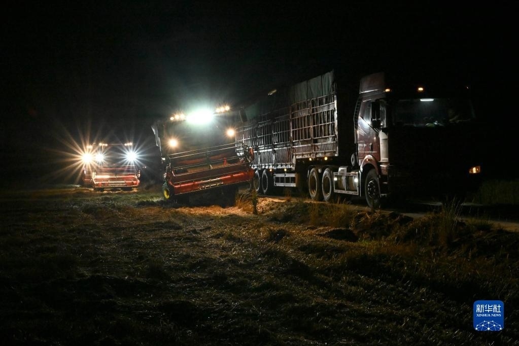 6月2日夜晚,在阜陽市阜南縣苗集鎮(zhèn)的一處麥田,農(nóng)機(jī)手駕駛收割機(jī)將收獲的小麥裝車。