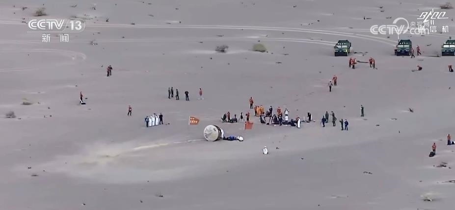 返回艙成功著陸,擔(dān)負(fù)搜救回收任務(wù)的搜救分隊(duì)及時(shí)發(fā)現(xiàn)目標(biāo)并抵達(dá)著陸現(xiàn)場(chǎng)。