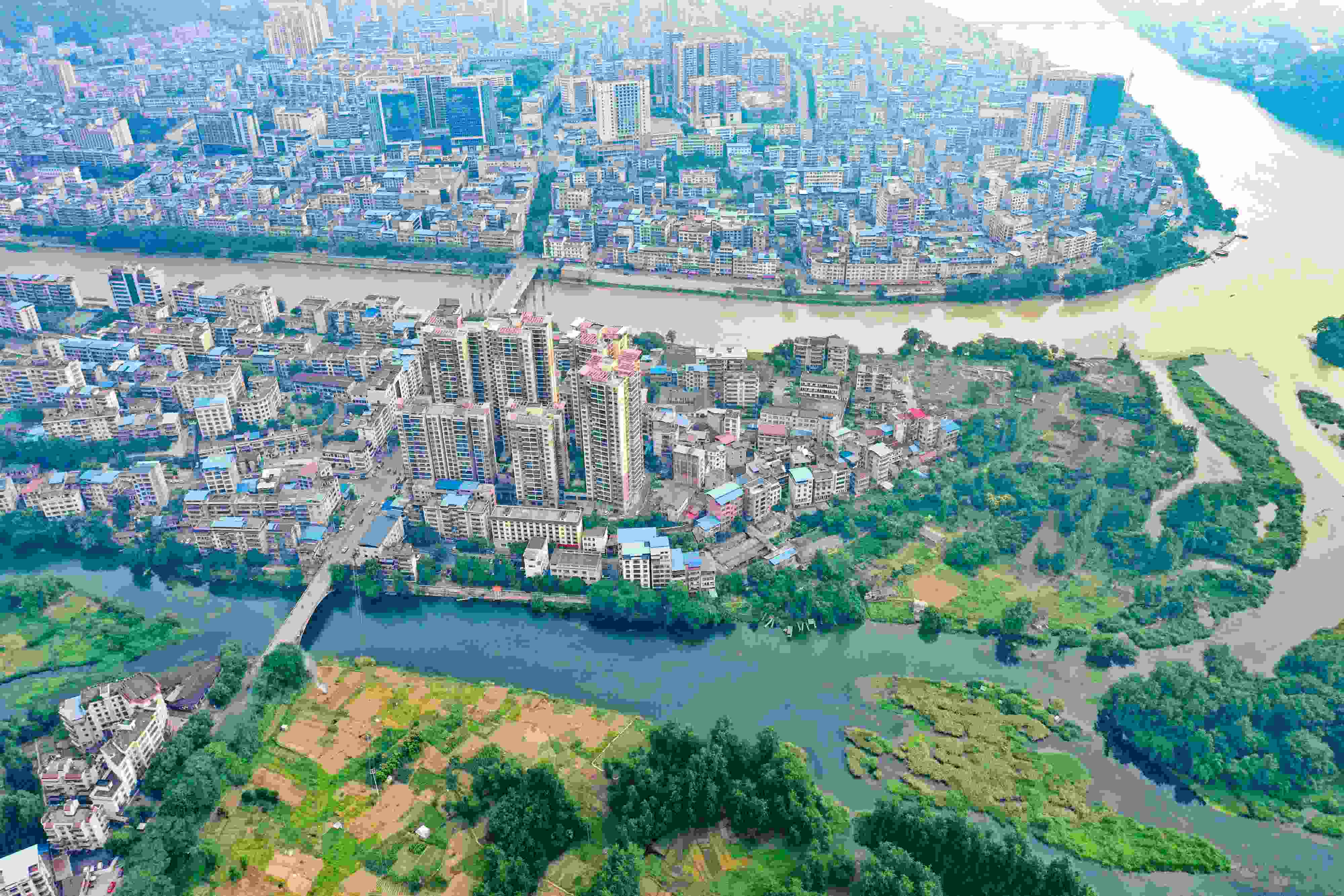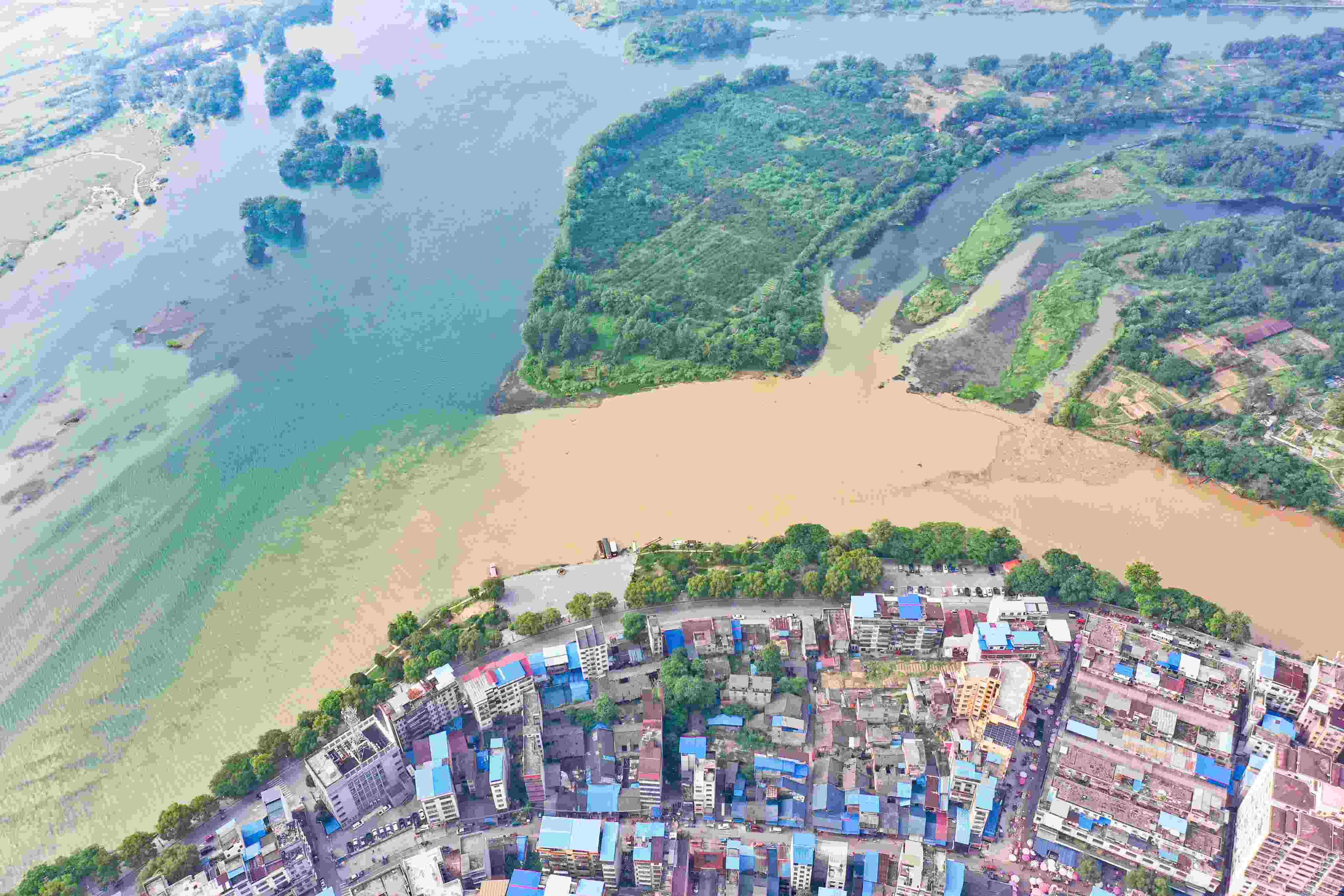 2023年6月4日,受降雨影響,廣西桂林全州縣城湘江河段出現(xiàn)涇渭分明景觀。空中俯瞰,湘江支流萬鄉(xiāng)河混濁的河水繞城匯入清澈的湘江干流,交匯之處涇渭分明。 視覺中國
