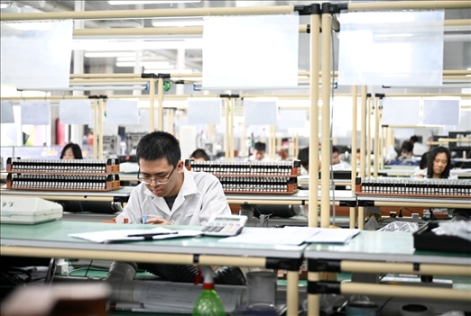 工作人員在天津宜科自動(dòng)化股份有限公司傳感器生產(chǎn)車(chē)間內(nèi)工作。新華社記者 趙子碩 攝