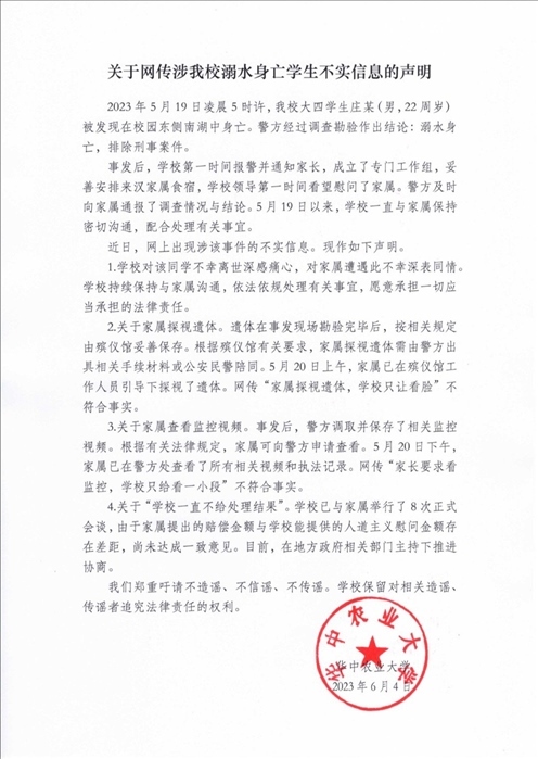 ·學生溺水身亡、不給家長看監(jiān)控視頻?華中農(nóng)業(yè)大學回應(yīng):傳言不實。