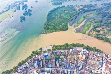 受降雨影響,廣西桂林全州縣城湘江河段出現(xiàn)涇渭分明景觀??罩懈╊?,湘江支流萬鄉(xiāng)河混濁的河水繞城匯入清澈的湘江干流,交匯之處涇渭分明。