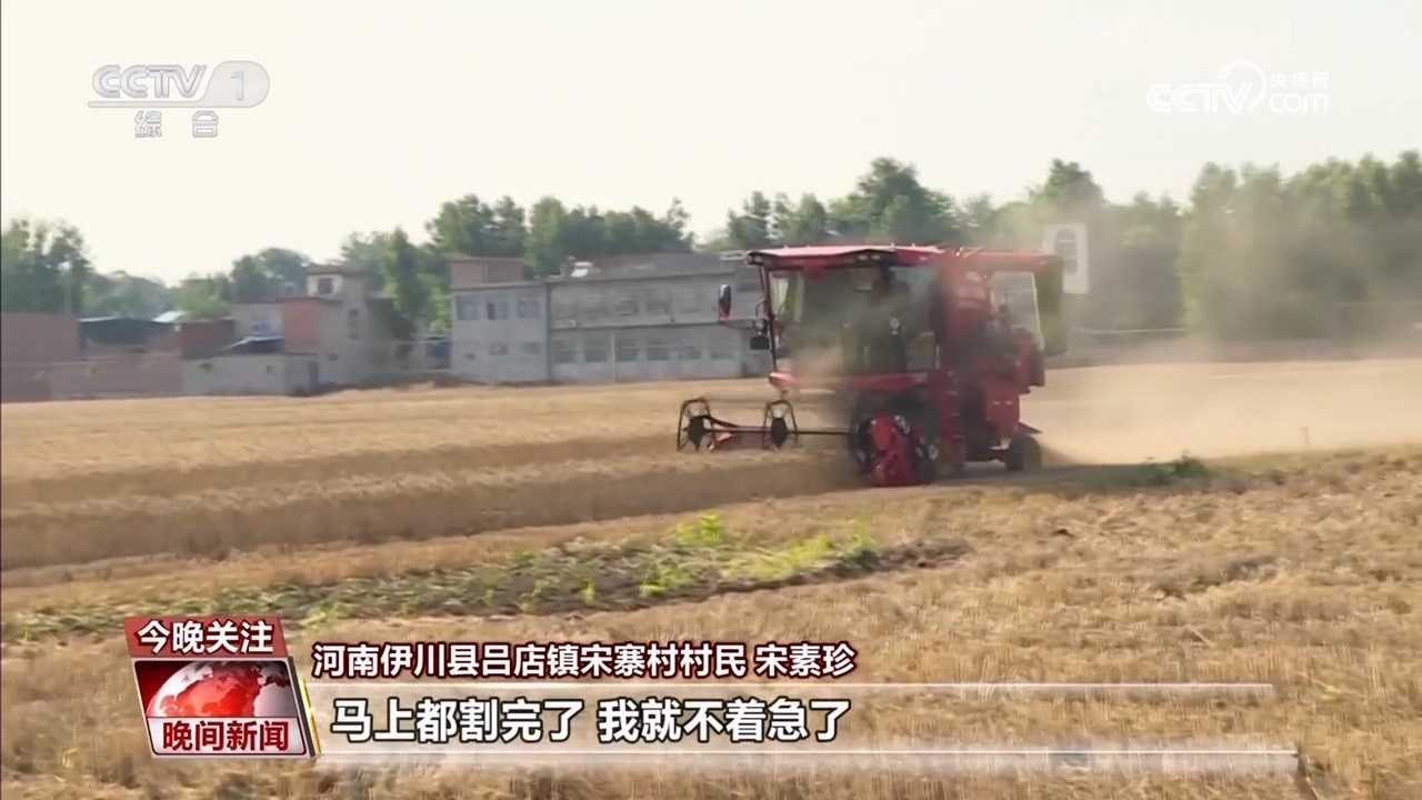 伊川縣呂店鎮(zhèn)宋寨村村民 宋素珍:前幾天下雨小麥收不回來,心里可心慌,鄉(xiāng)里派履帶式收割機,我這十幾畝地馬上都挨住(輪到)了,馬上都割完了,我就不著急了。