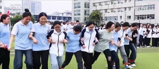 在四川廣漢中學(xué),一場專門針對高三學(xué)子的趣味接力賽正在開展。同學(xué)們在完成賽跑、跳繩等項目的同時,需要團隊協(xié)作完成顛網(wǎng)球、射門等項目。