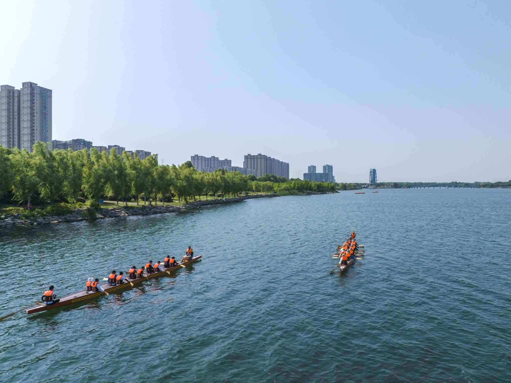 2023年6月8日,江蘇連云港,東??h西雙湖風(fēng)景區(qū),多支龍舟隊(duì)在西雙湖水域進(jìn)行訓(xùn)練,積極備戰(zhàn)端午龍舟賽。視覺中國(guó)