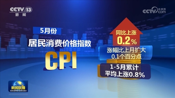從同比看,5月份,居民消費價格指數(shù)CPI同比上漲0.2%,漲幅比上月擴大0.1個百分點,1—5月累計平均上漲0.8%。