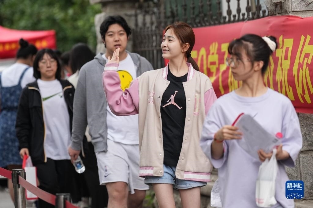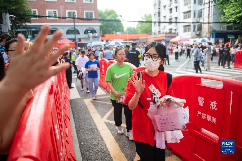 6月7日,在北京師范大學(xué)附屬實(shí)驗(yàn)中學(xué)考點(diǎn)門口,考生走進(jìn)考點(diǎn)后向家長(zhǎng)揮手。