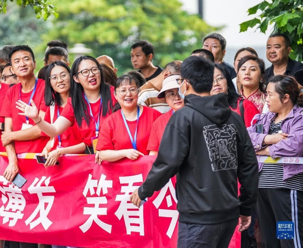 6月7日,送考老師在貴陽市烏當(dāng)中學(xué)考點(diǎn)給學(xué)生加油打氣。