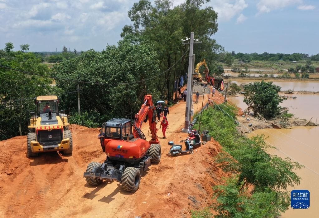 6月11日,在廣西合浦縣白沙鎮(zhèn),工人在施工修復(fù)遭洪水損毀的堤壩(無人機(jī)照片)。