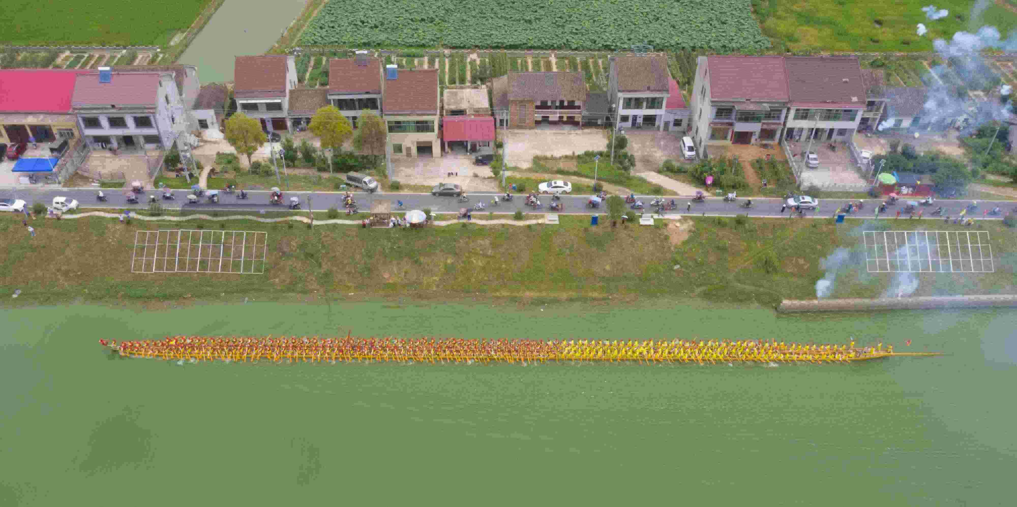 2023年6月12日,由北岸新村打造的長(zhǎng)達(dá)99.9米的巨型雙橈龍舟在湖南省益陽(yáng)市赫山區(qū)蘭溪鎮(zhèn)舉行“百米龍舟”登江儀式。