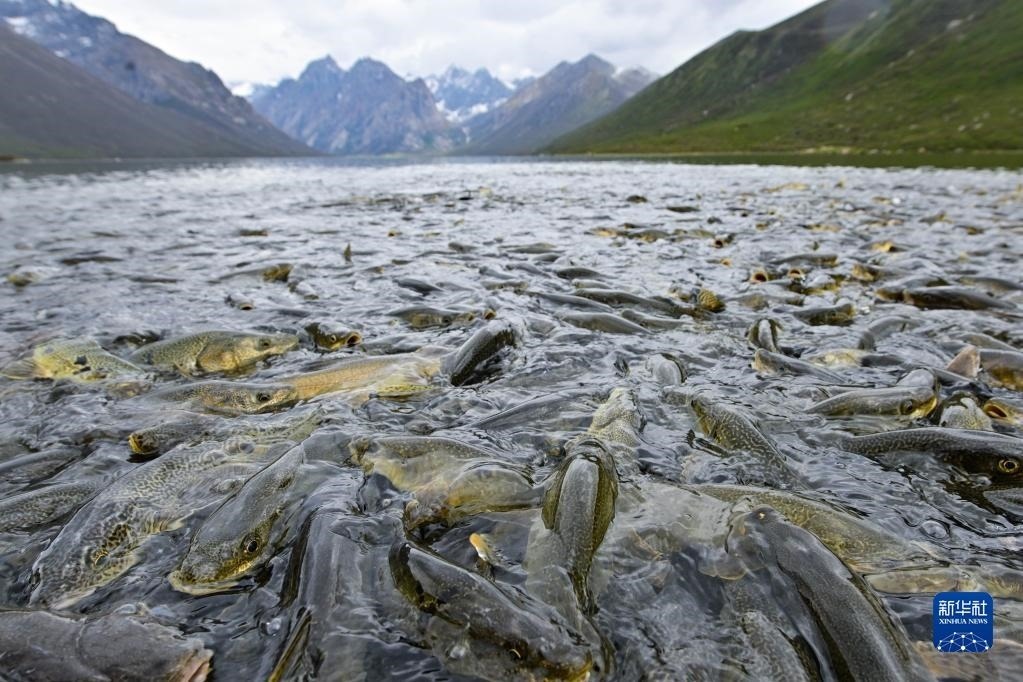 6月11日,在青海省果洛藏族自治州久治縣境內(nèi)的年保玉則,裸鯉在水中活動。