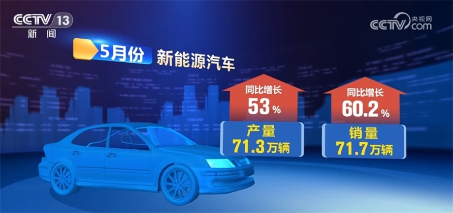 其中,新能源汽車產(chǎn)銷量分別完成71.3萬輛和71.7萬輛,同比分別增長(zhǎng)53%和60.2%,市場(chǎng)占有率達(dá)到30.1%。在出口方面,5月份,全國汽車出口38.9萬輛,同比增長(zhǎng)58.7%。