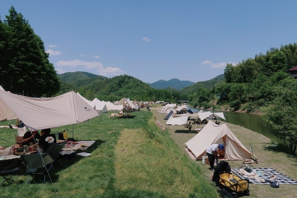 人們?cè)诤菔邪布h“小杭坑”營(yíng)地休閑(2022年5月3日攝)。新華社記者 鄭夢(mèng)雨 攝