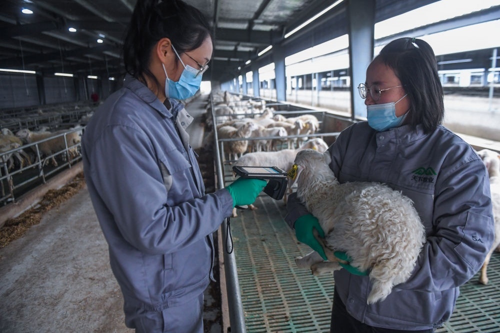 浙江省湖州市長(zhǎng)興縣呂山鄉(xiāng)湖羊智慧循環(huán)產(chǎn)業(yè)園的工作人員在掃描湖羊幼仔耳朵上的數(shù)字芯片(2022年1月6日攝)。新華社記者 徐昱 攝