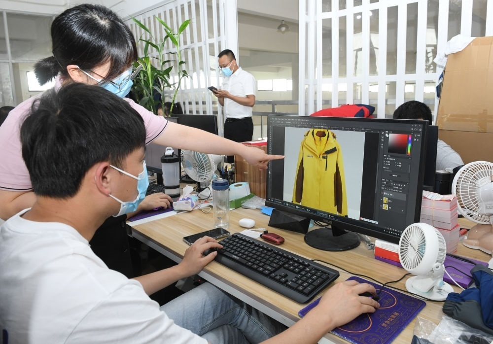 在浙江省臺(tái)州市三門(mén)縣的一家戶外用品企業(yè),工作人員在討論一款沖鋒衣的設(shè)計(jì)(2022年6月14日攝)。新華社記者 翁忻旸 攝