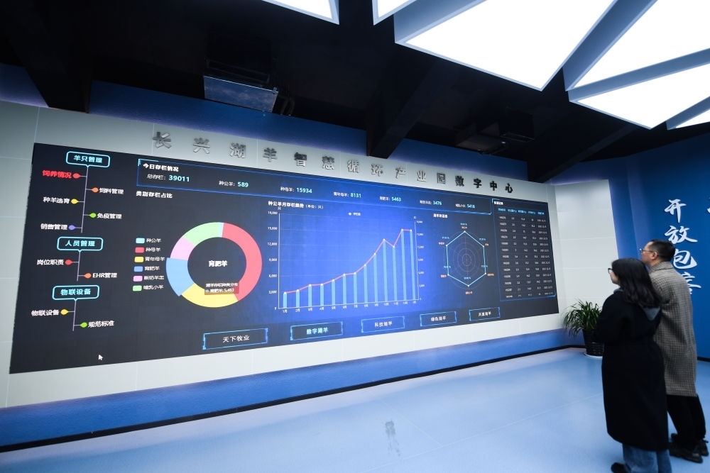 浙江省湖州市長(zhǎng)興縣呂山鄉(xiāng)湖羊智慧循環(huán)產(chǎn)業(yè)園里的數(shù)字大屏實(shí)時(shí)顯示湖羊的各類監(jiān)控?cái)?shù)據(jù)(2022年1月6日攝)。新華社記者 徐昱 攝