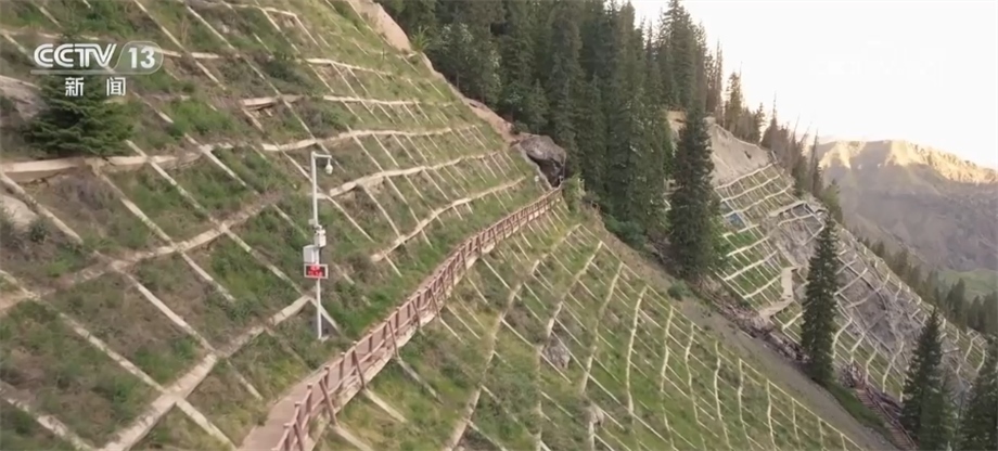 天池的水來自于天山深處的冰川融水,由南向北形成多條瀑布、河流,一路向山下奔流,成為當(dāng)?shù)刂匾霓r(nóng)業(yè)灌溉水源,滋養(yǎng)著下游80多萬(wàn)畝土地。我們現(xiàn)在看到這些鋪在山野中的網(wǎng)格,就是當(dāng)?shù)卣谶M(jìn)行的生態(tài)修復(fù)與地質(zhì)災(zāi)害防治工程,人們?cè)谶@些網(wǎng)格間播撒草籽,來穩(wěn)定區(qū)域生態(tài)環(huán)境,有效防范地質(zhì)災(zāi)害的發(fā)生。