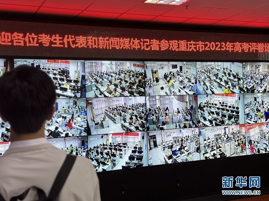 工作人員通過視頻查看閱卷現(xiàn)場情況。新華網 彭浩然 攝