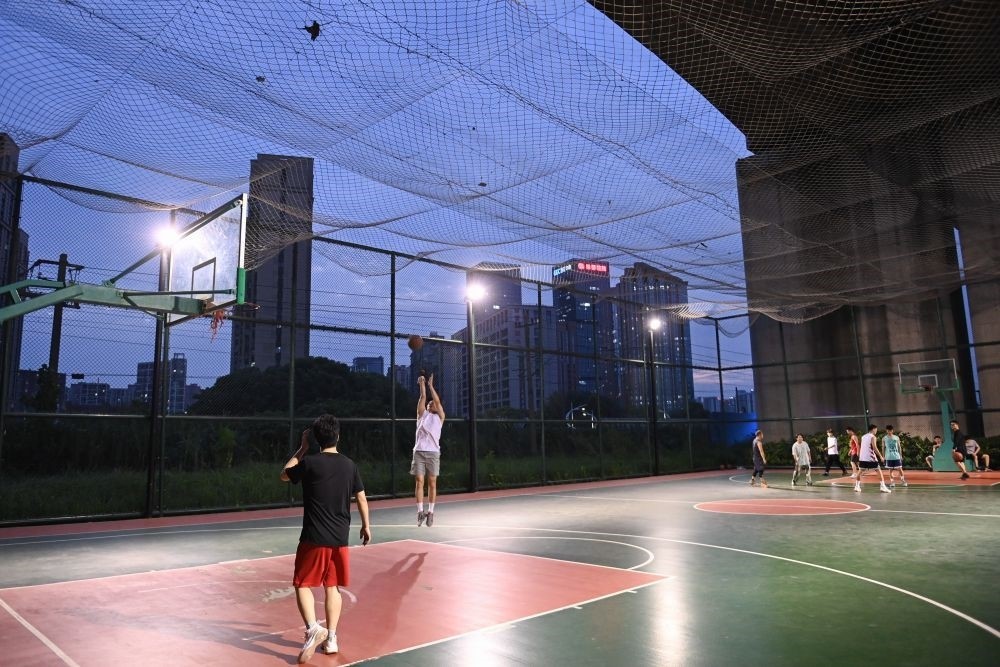 2022年9月20日,市民在位于高鐵橋下的錢江世紀(jì)城體育公園打籃球。在杭州,一批運(yùn)動(dòng)場(chǎng)館見縫插針地“嵌入”市民生活圈,城市空間的“邊角余料”正成為全民健身的“金角銀邊”。新華社記者 黃宗治 攝
