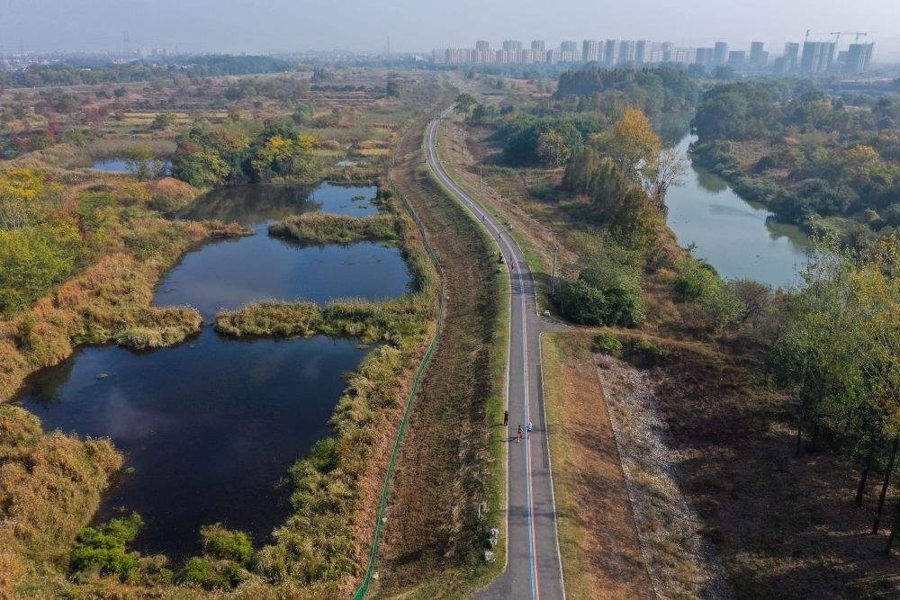 2022年11月12日,運(yùn)動(dòng)愛好者們?cè)谡憬『贾菔杏嗪紖^(qū)瓶窯鎮(zhèn)北湖草蕩生態(tài)濕地的健身游步道上參加健康跑比賽(無(wú)人機(jī)照片)。新華社記者 徐昱 攝