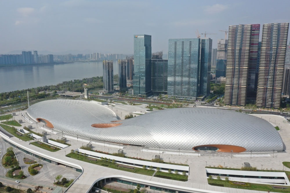 2021年8月2日拍攝的杭州奧體中心場(chǎng)館群(無(wú)人機(jī)照片)。新華社發(fā)(杭州亞組委供圖)
