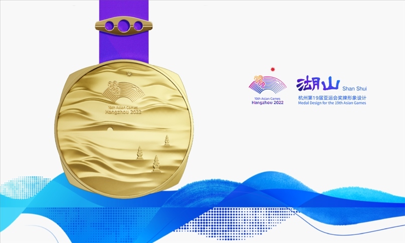 獎牌取名為“湖山”,它的設(shè)計靈感源自五千年良渚文明,展示中國江南文化,呈現(xiàn)杭州山水景觀。在亞運會獎牌設(shè)計中首次將方形玉琮和圓形獎?wù)氯跒橐惑w,其中獎牌正面用凸出的線條勾勒出“三面云山一面城”的杭城畫卷,湖水漣漪,山巒起伏;獎牌背面,形似方形印章,寓意運動員們在杭州亞運會上留下美好的印記。
