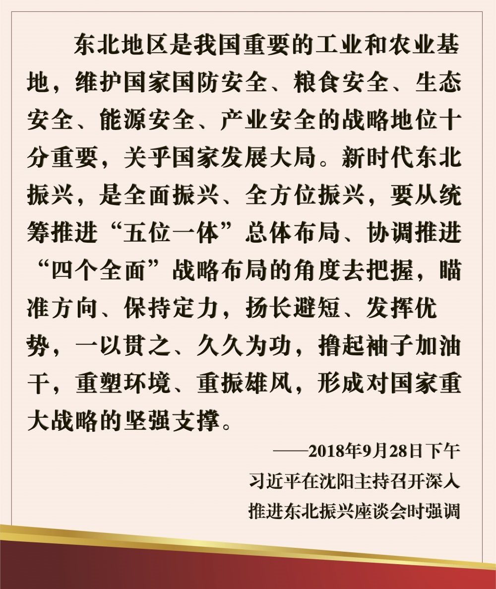 黨中央高度重視東北振興。習(xí)近平總書記多次到當(dāng)?shù)乜疾煺{(diào)研,他說:“我們對(duì)新時(shí)代東北全面振興充滿信心、也充滿期待。”
