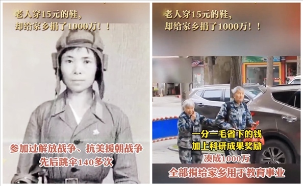 馬旭,我國第一代女空降兵,曾和黃繼光在同一部隊,參加過解放戰(zhàn)爭、抗美援朝戰(zhàn)爭。5年前的今天,年過八旬的馬旭夫婦去銀行匯款,因數(shù)額巨大,銀行工作人員擔(dān)心老人被騙報警,民警趕到現(xiàn)場后,核實發(fā)現(xiàn)兩位老人確實決定將畢生積蓄1000萬元,分兩次全部捐給家鄉(xiāng)。也正是這次“烏龍”,讓馬旭夫婦出現(xiàn)在了公眾視野。她曾獲評“感動中國2018年度人物”,頒獎詞是:你畢生節(jié)儉,只為一次奢侈,耐得清貧,守得心靈的高貴。