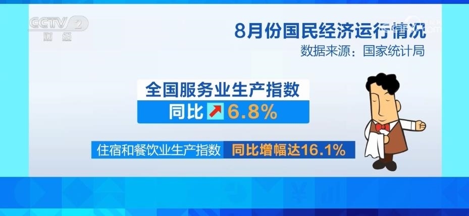 服務業(yè)較快增長,8月份,全國服務業(yè)生產指數同比增長6.8%。其中,住宿和餐飲業(yè)依然保持較快增長,生產指數同比增幅達到16.1%。