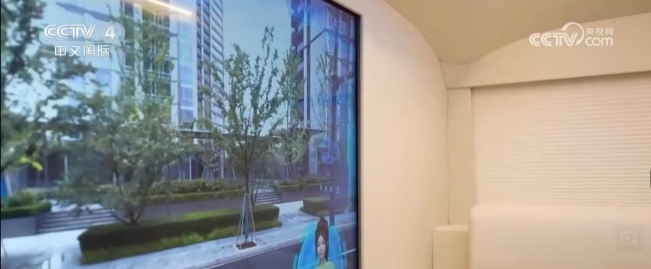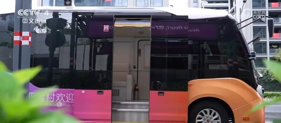 總臺(tái)記者 黃珊:亞運(yùn)村里的AR智能巴士在全自動(dòng)巡航狀態(tài)下,能為乘客提供接駁、講解的服務(wù)。正前方的特殊窗戶結(jié)合車載AR功能,透過它能夠看到車外的實(shí)時(shí)影像,結(jié)合虛擬場(chǎng)景,虛實(shí)結(jié)合,非常奇妙。
