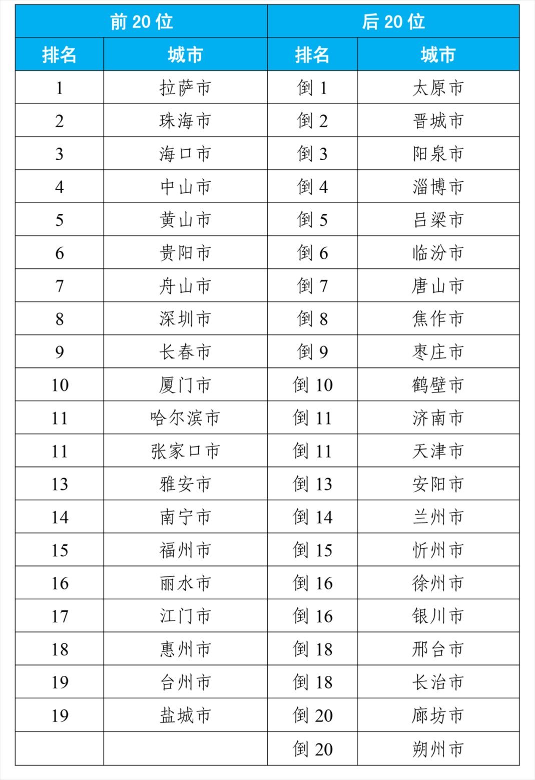 8月,168個(gè)重點(diǎn)城市中,空氣質(zhì)量排名前20位城市依次是拉薩、珠海和??诘瘸鞘校◤牡?名至并列第19名);空氣質(zhì)量排名后20位城市依次是太原、晉城和陽(yáng)泉等城市(從倒數(shù)第1名至并列倒數(shù)第20名)。見附表1。