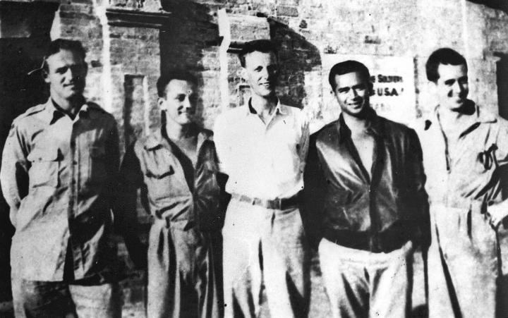 二戰(zhàn)期間,被新四軍營救的5名美國飛虎隊飛行員在新四軍駐地合影(1944年8月攝)。新華社發(fā)
