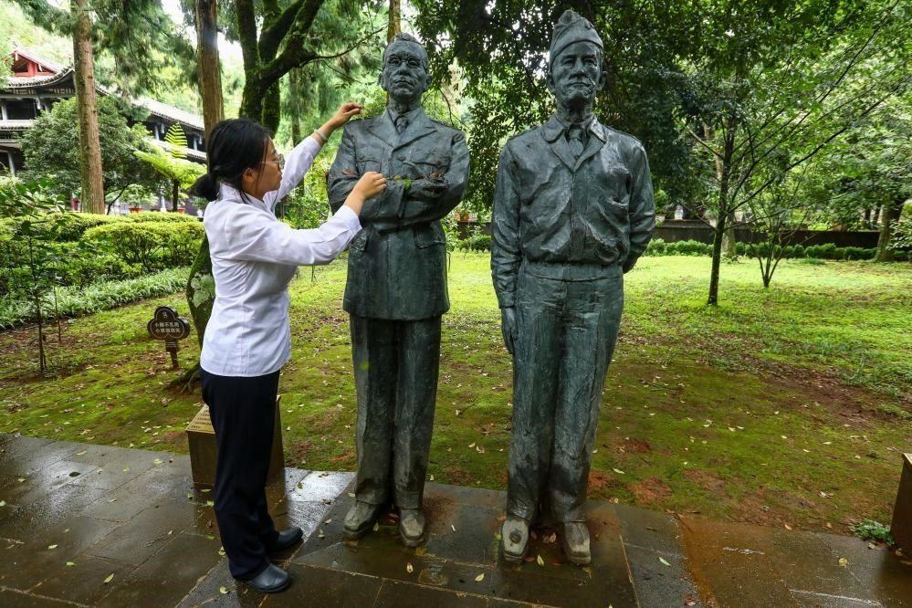 8月31日,在云南騰沖市國殤墓園內(nèi),工作人員為史迪威將軍雕像(左為史迪威、右為陳納德)清理落葉。
