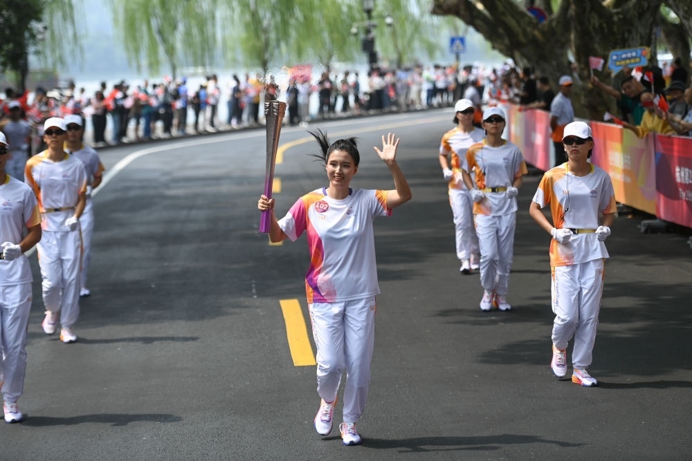 2023年9月8日,杭州亞運會火炬?zhèn)鬟f在杭州西湖涌金公園廣場啟動?;鹁媸滞跚啁t在火炬?zhèn)鬟f中。新華社記者 黃宗治攝