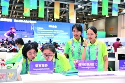 9月22日,亞運(yùn)會(huì)主新聞中心的志愿者們在工作。本報(bào)記者 楊震攝/光明圖片