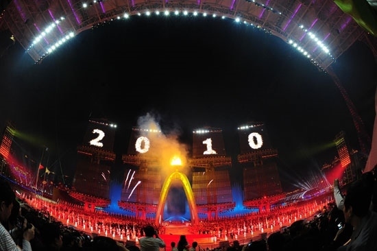 2010年11月12日,廣州,第十六屆亞運(yùn)會開幕式在海心沙島隆重舉行,圖為主火炬點(diǎn)火儀式。視覺中國供圖