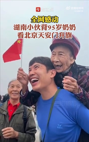 近日,湖南一名男子背著95歲的奶奶,從永州出發(fā)到北京天安門看升國(guó)旗。看著五星紅旗冉冉升起,祖孫兩人露出了幸福的笑容。網(wǎng)友:這是“最美的風(fēng)景”。