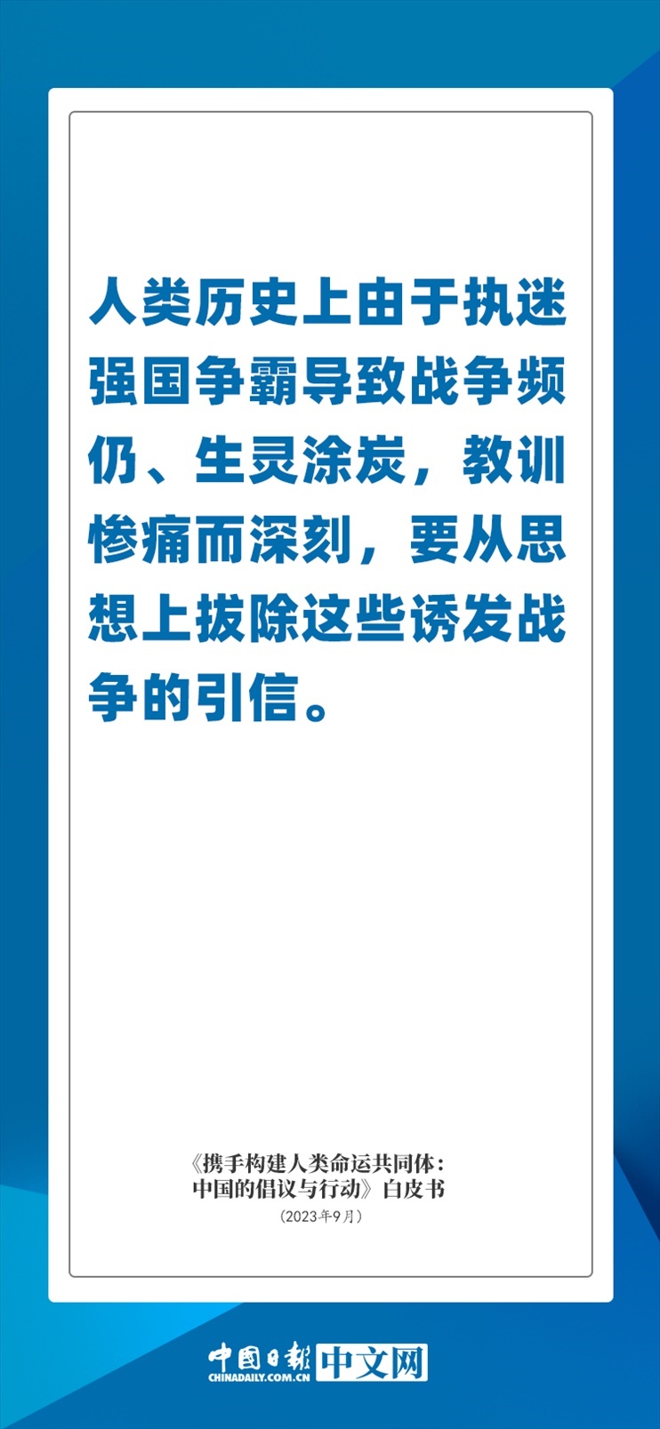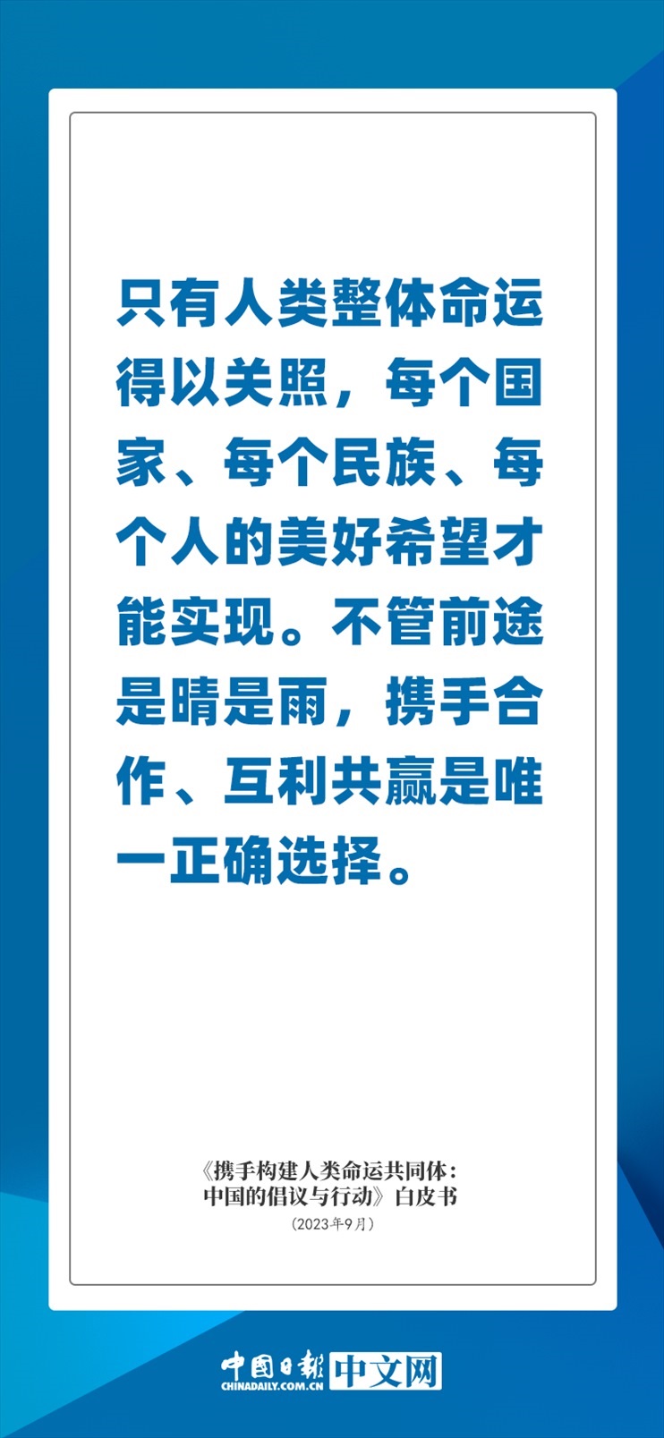 國(guó)務(wù)院新聞辦公室于2023年9月26日發(fā)布《攜手構(gòu)建人類命運(yùn)共同體:中國(guó)的倡議與行動(dòng)》白皮書(shū),發(fā)人深思催人奮進(jìn)。