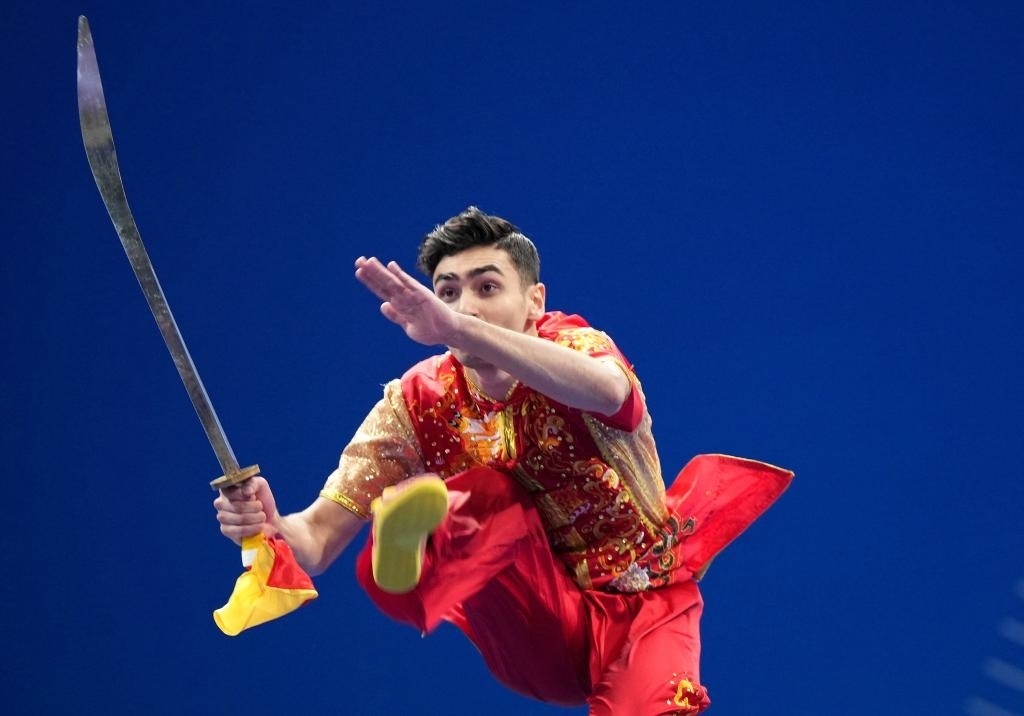 9月27日,伊朗選手侯賽因·蓋卜萊納邁·穆加達姆在刀術比賽中。當日,杭州亞運會武術男子刀術棍術全能決賽在杭州蕭山瓜瀝文化體育中心舉行。新華社記者 李一博 攝