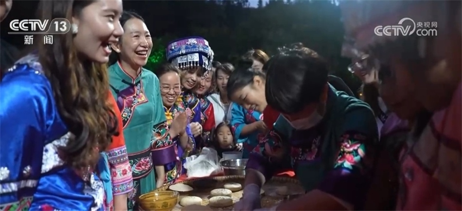 隨著歡快的音樂響起,當(dāng)?shù)卮迕翊┥仙术r艷的節(jié)日盛裝,踏著鼓點,圍著篝火跳起土家擺手舞,豐收的喜悅洋溢在村民們的臉上,游客們加入其中,大家手牽著手,共同舞出金秋和美鄉(xiāng)村新畫卷。