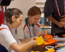 9月25日,一名日本運(yùn)動(dòng)員(右)在淳安賽區(qū)傳統(tǒng)工藝體驗(yàn)坊和志愿者合影。