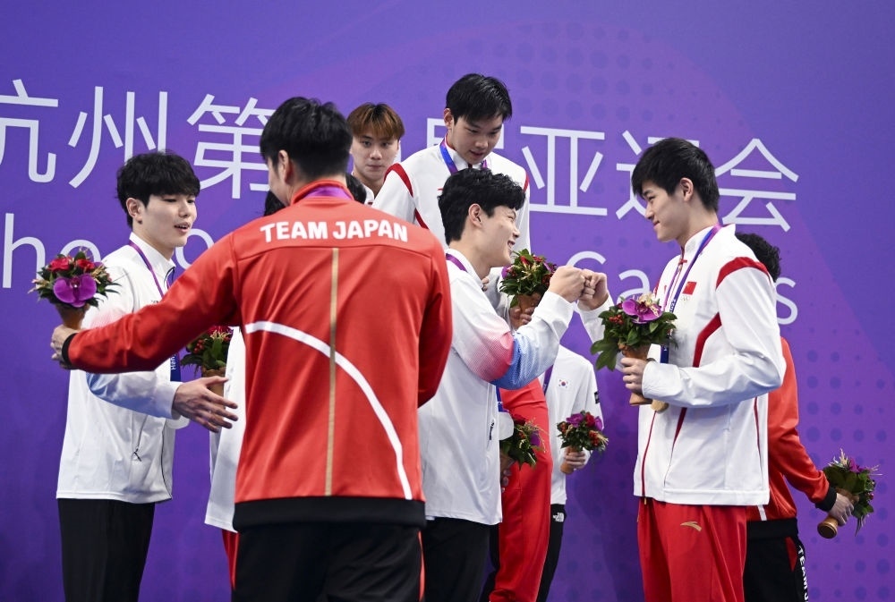 9月28日,中國(guó)隊(duì)選手在男子4X100米自由泳接力決賽后與韓國(guó)隊(duì)和日本隊(duì)選手致意。