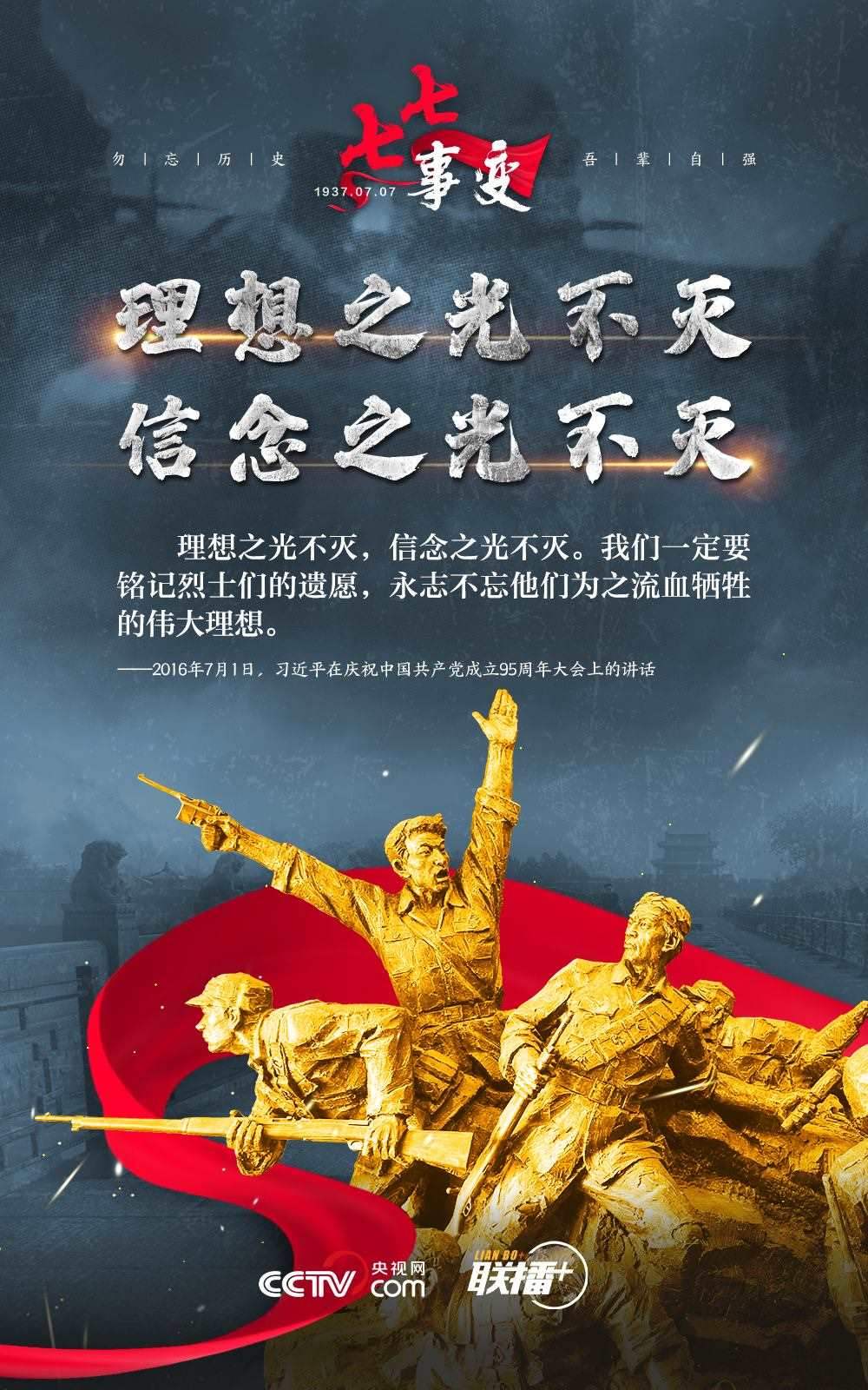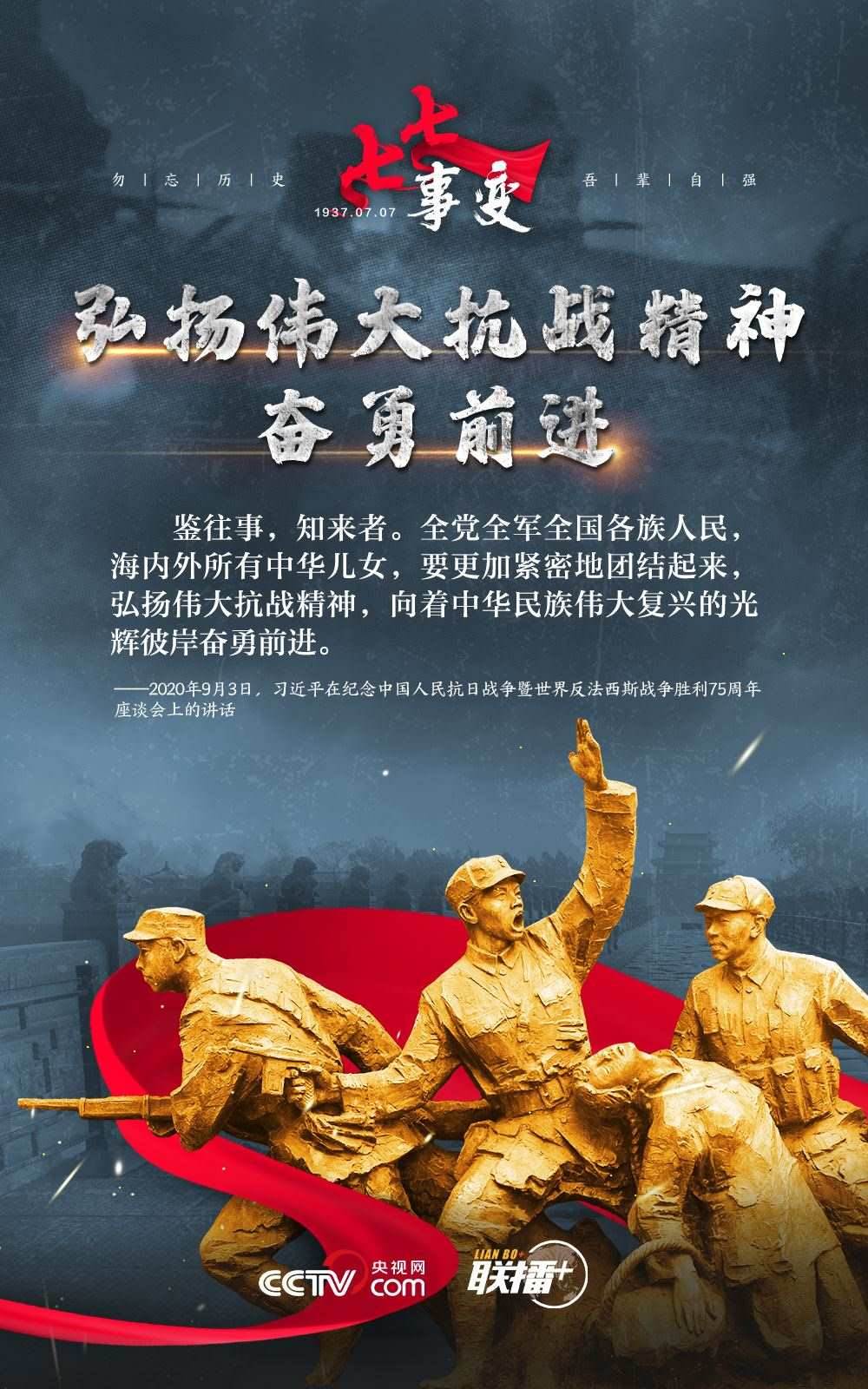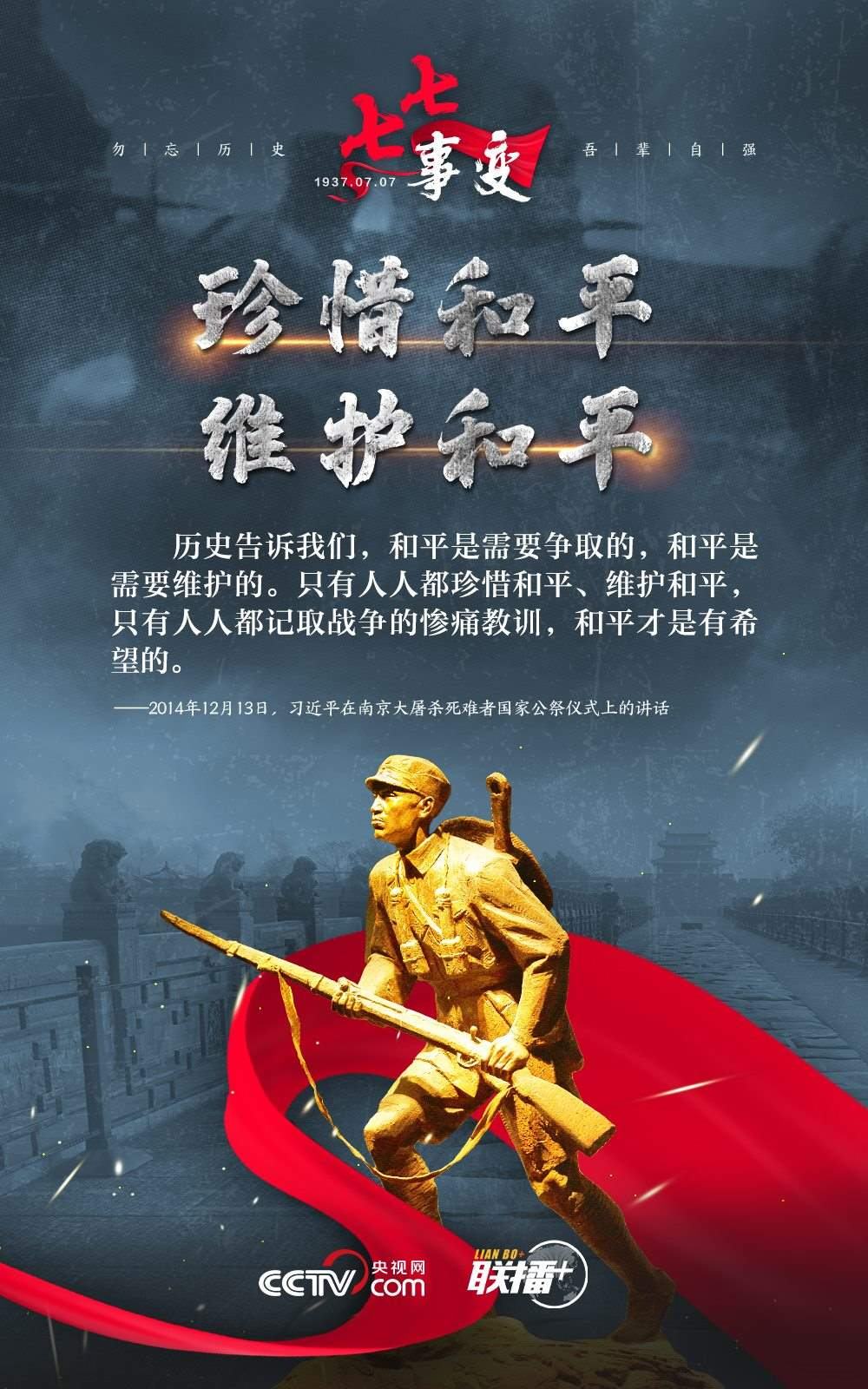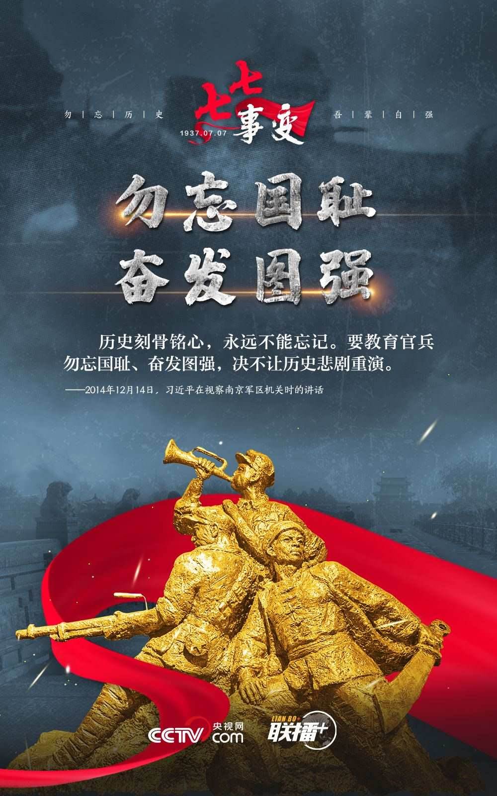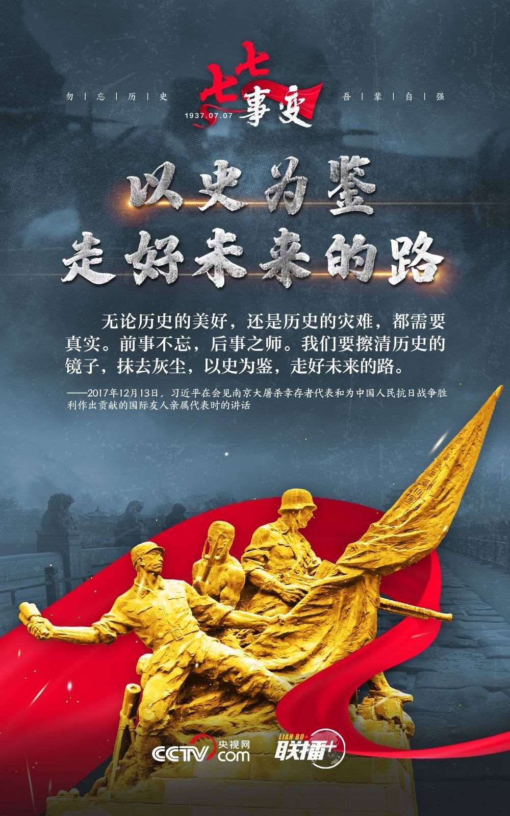 悼念同胞,緬懷先烈。勿忘歷史,吾輩自強(qiáng)!在“七七事變”86周年之際,央視網(wǎng)《聯(lián)播+》欄目特推出海報,與您一起從總書記講話中汲取自強(qiáng)不息的奮進(jìn)力量。