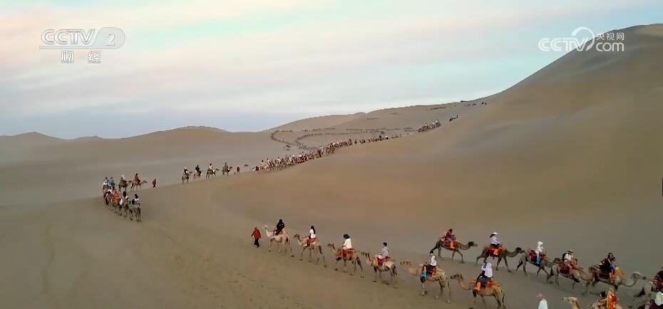 總臺(tái)記者 張磊:我現(xiàn)在所在的位置是敦煌的鳴沙山月牙泉景區(qū)。隨著暑期到來(lái),當(dāng)?shù)氐穆糜稳藬?shù)也在不斷攀升。大家可以在我身后看到,游客現(xiàn)在正在騎著駱駝沿著鳴沙山腳下不斷蜿蜒穿行,場(chǎng)面顯得十分壯觀。以前,只有在小長(zhǎng)假期間才會(huì)出現(xiàn)的“堵駱駝”的現(xiàn)象,這兩天已經(jīng)成為常態(tài)。